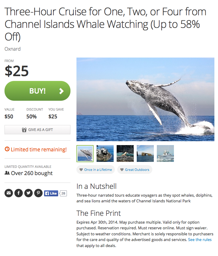 “We’re proud to work with CHANNEL ISLANDS WHALE WATCHING, and we’re honored to connect our customers with such great merchants who’ve delivered exceptional levels of service,” said Julie Szudarek, senior vice president, Groupon Local Deals.